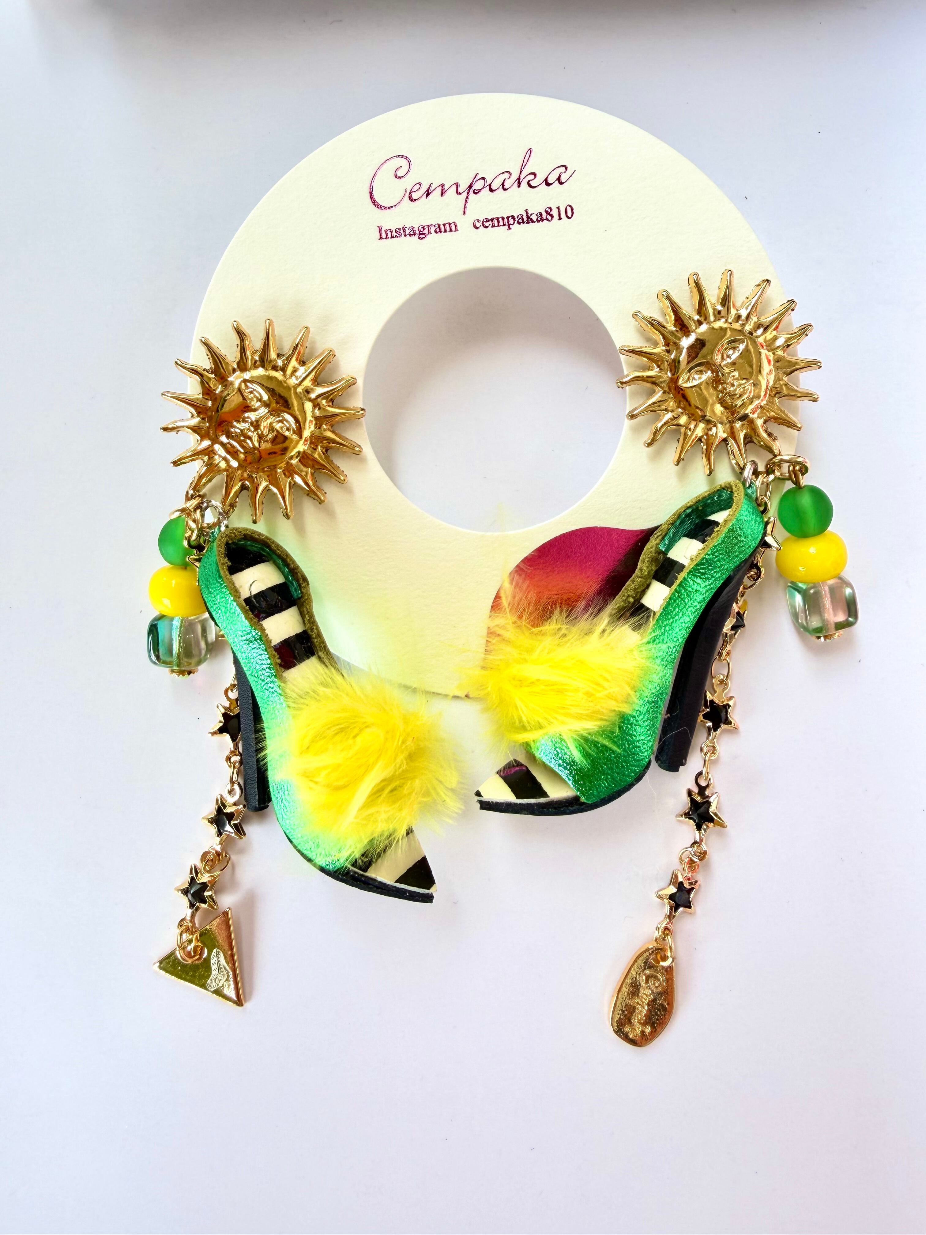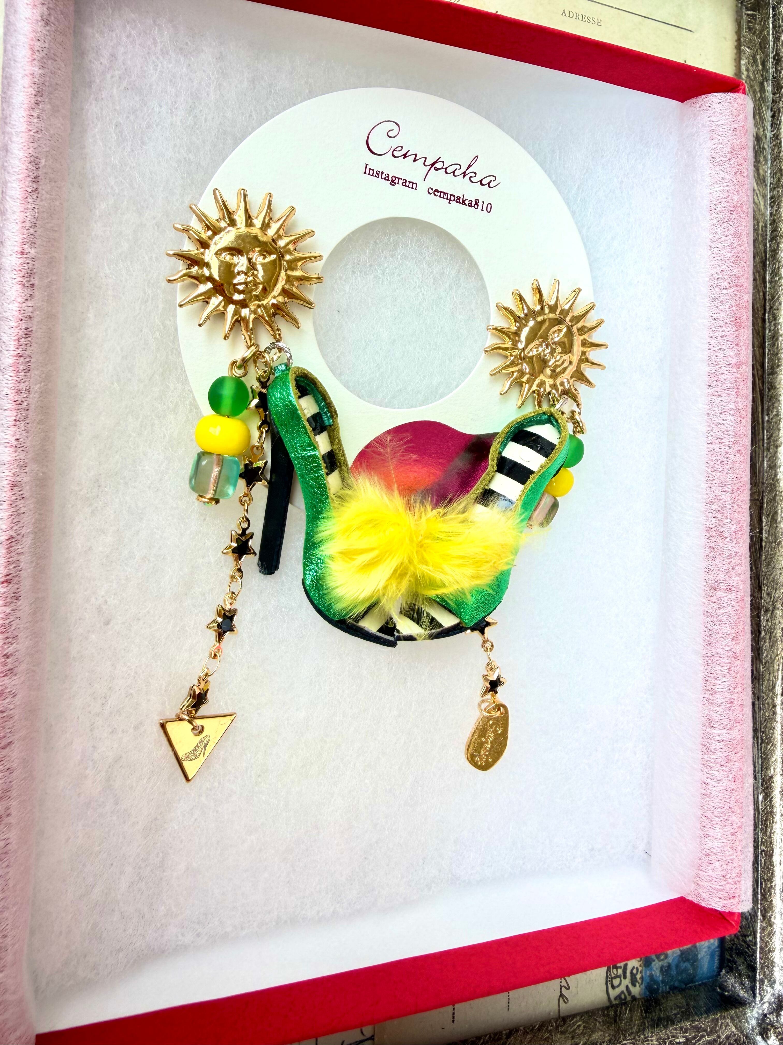 カナダの太陽のヴィンテージボタンにメタリックグリーン×ボーダーのミュールを合わせました。