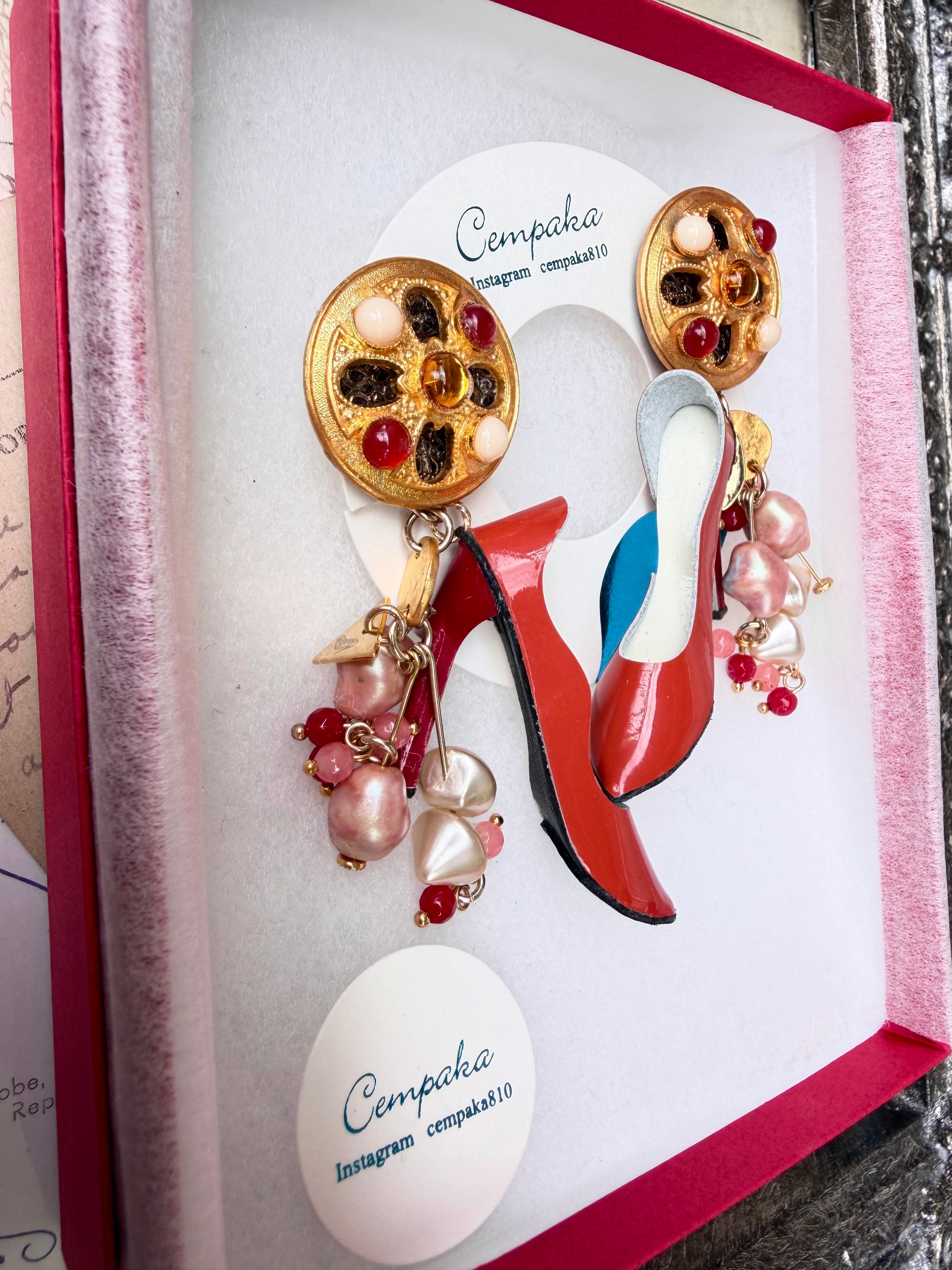 フランスのボタンコレクターのエリックさんの希少なボタンにオレンジのエナメル×白のエナメルのハイヒールを合わせました。