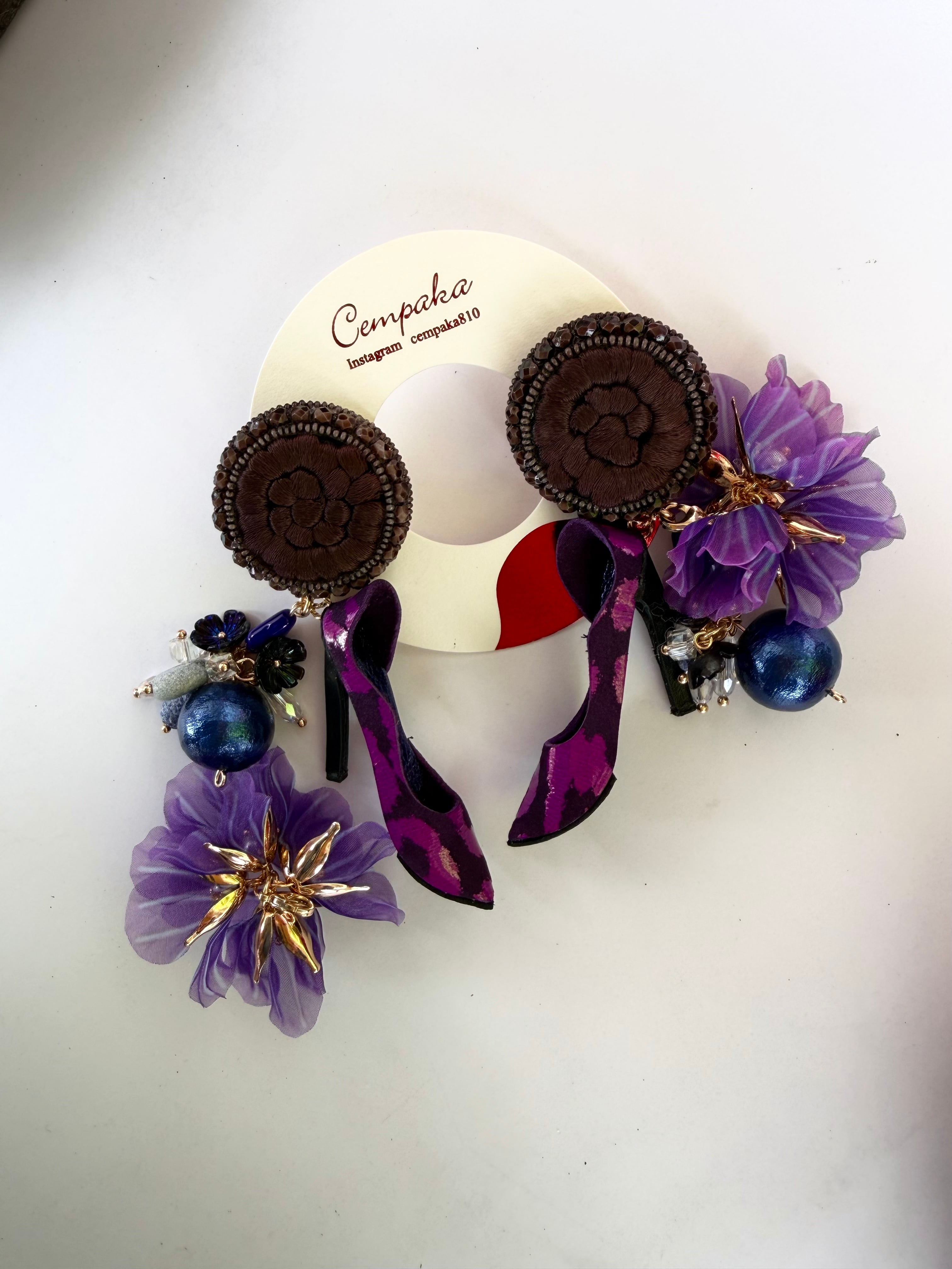 紫のレオパード×メタリックブルーの中敷のハイヒールを合わせました。