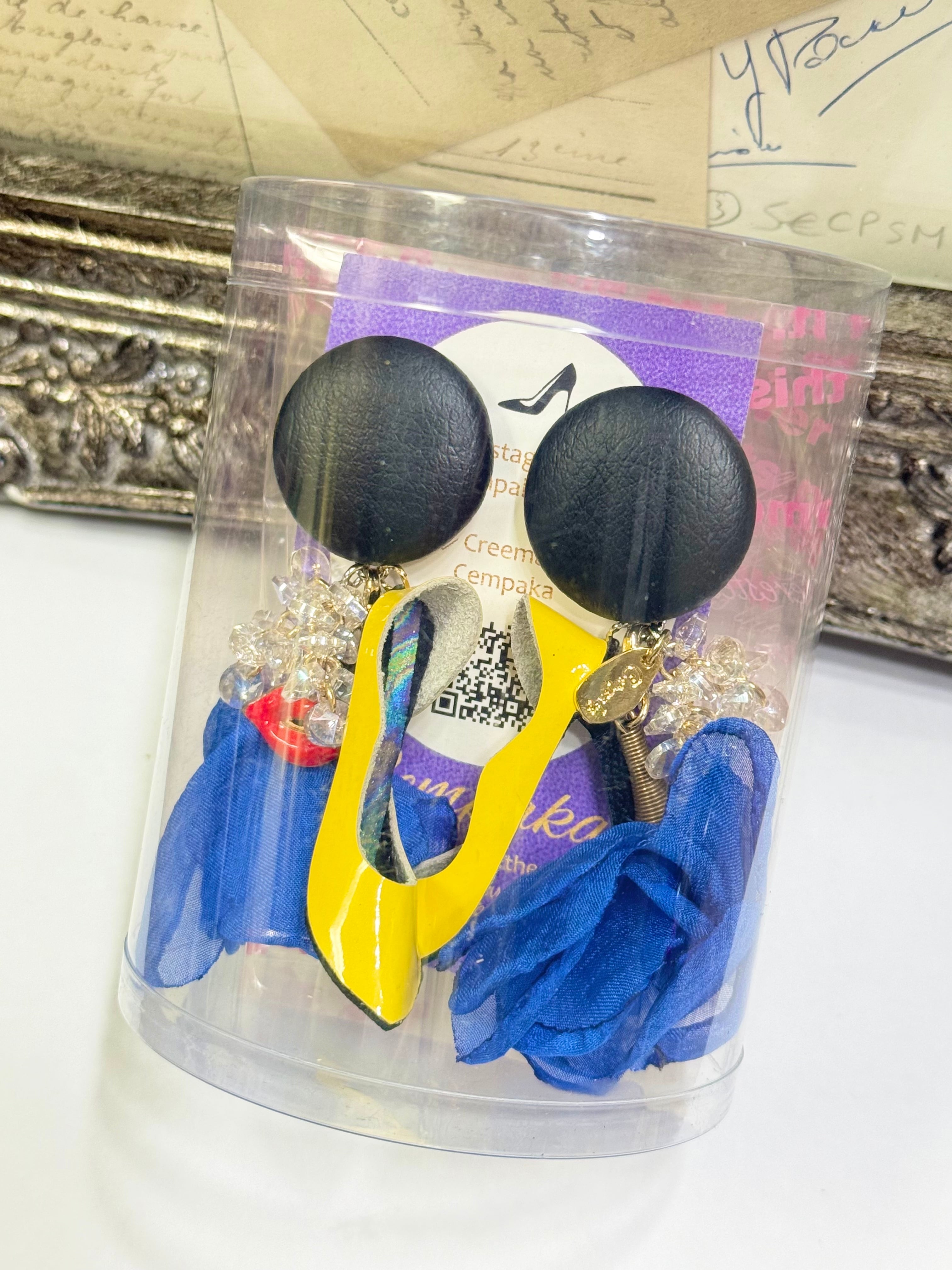 フェイクレザーのブラックのボタンにイエローのエナメル×メタリックのストライプ柄のハイヒールを合わせました。