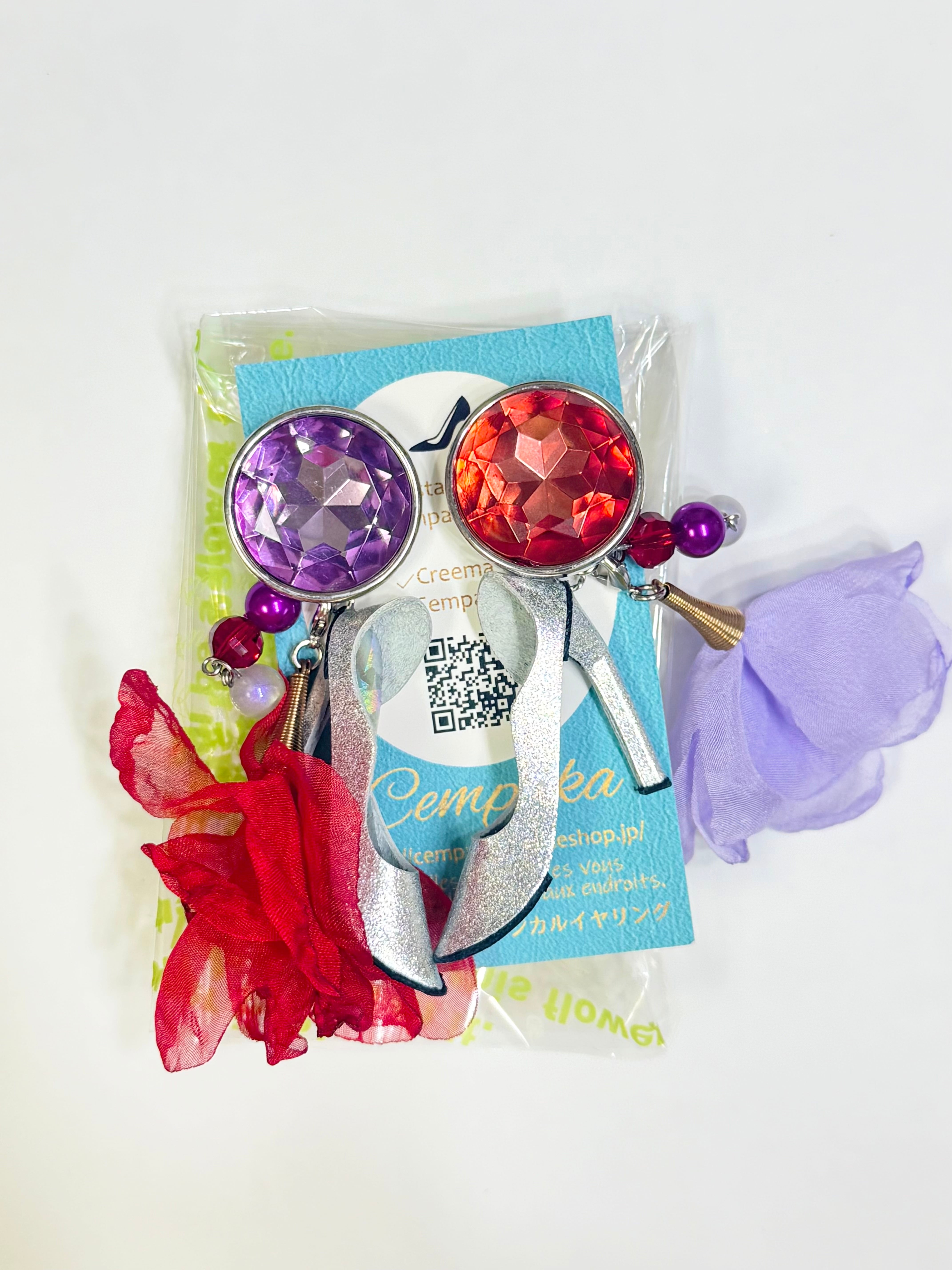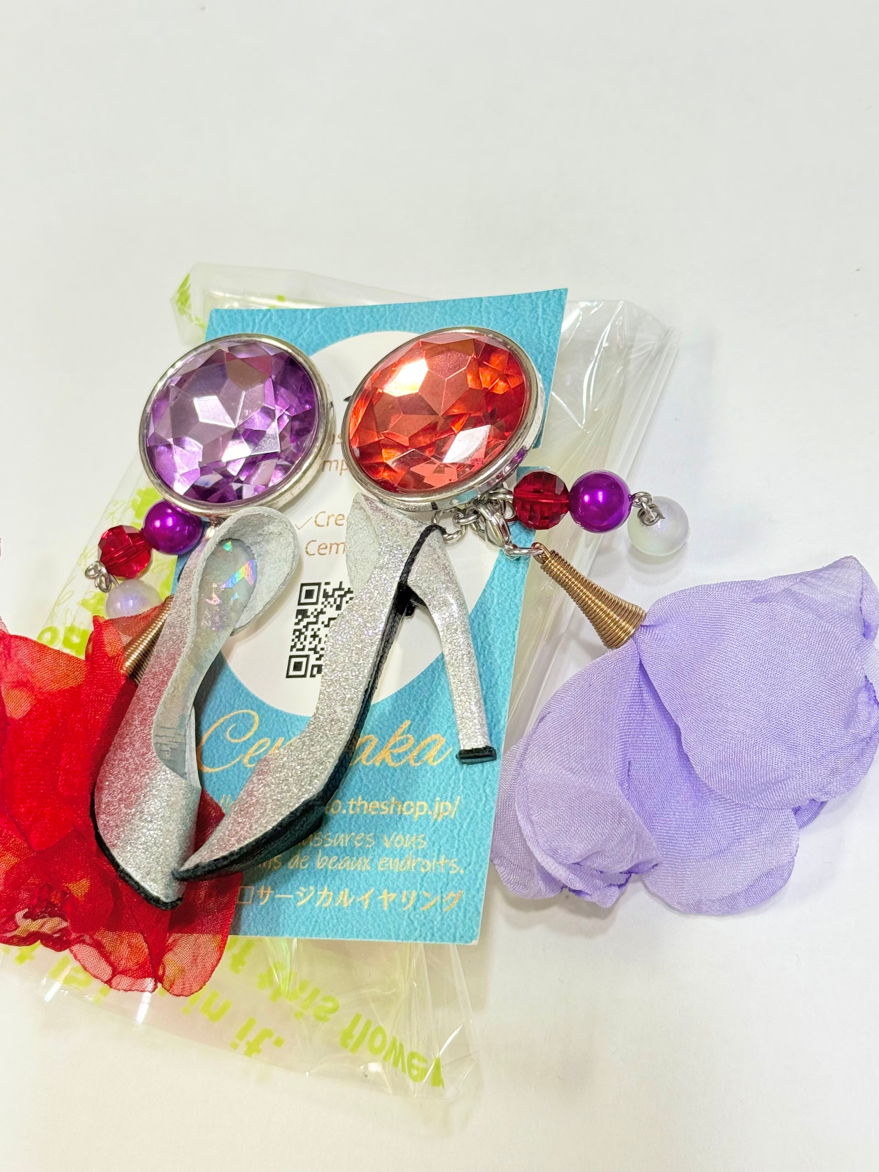 赤と紫のジュエルボタンにシルバーのハイヒールを合わせました。