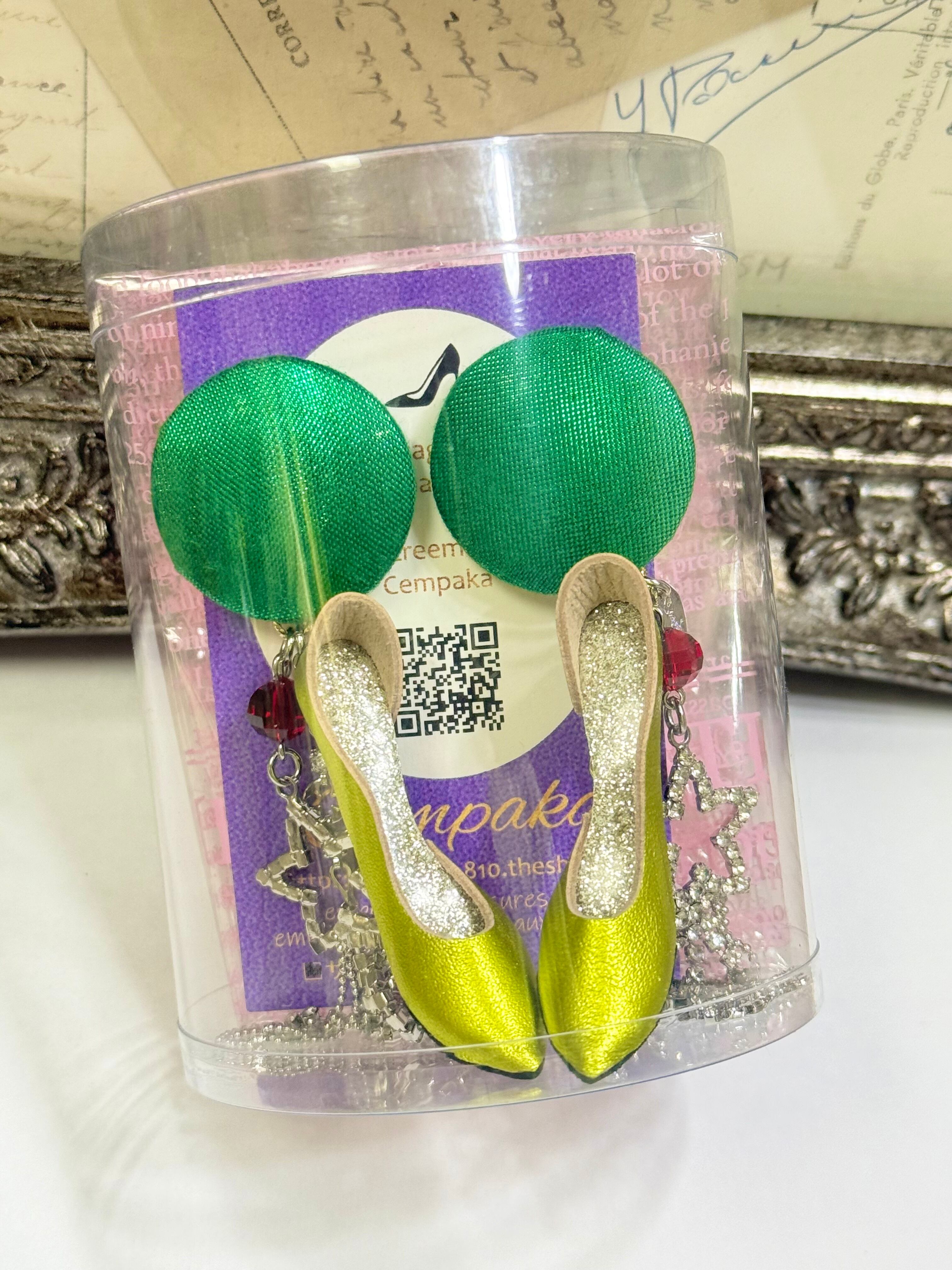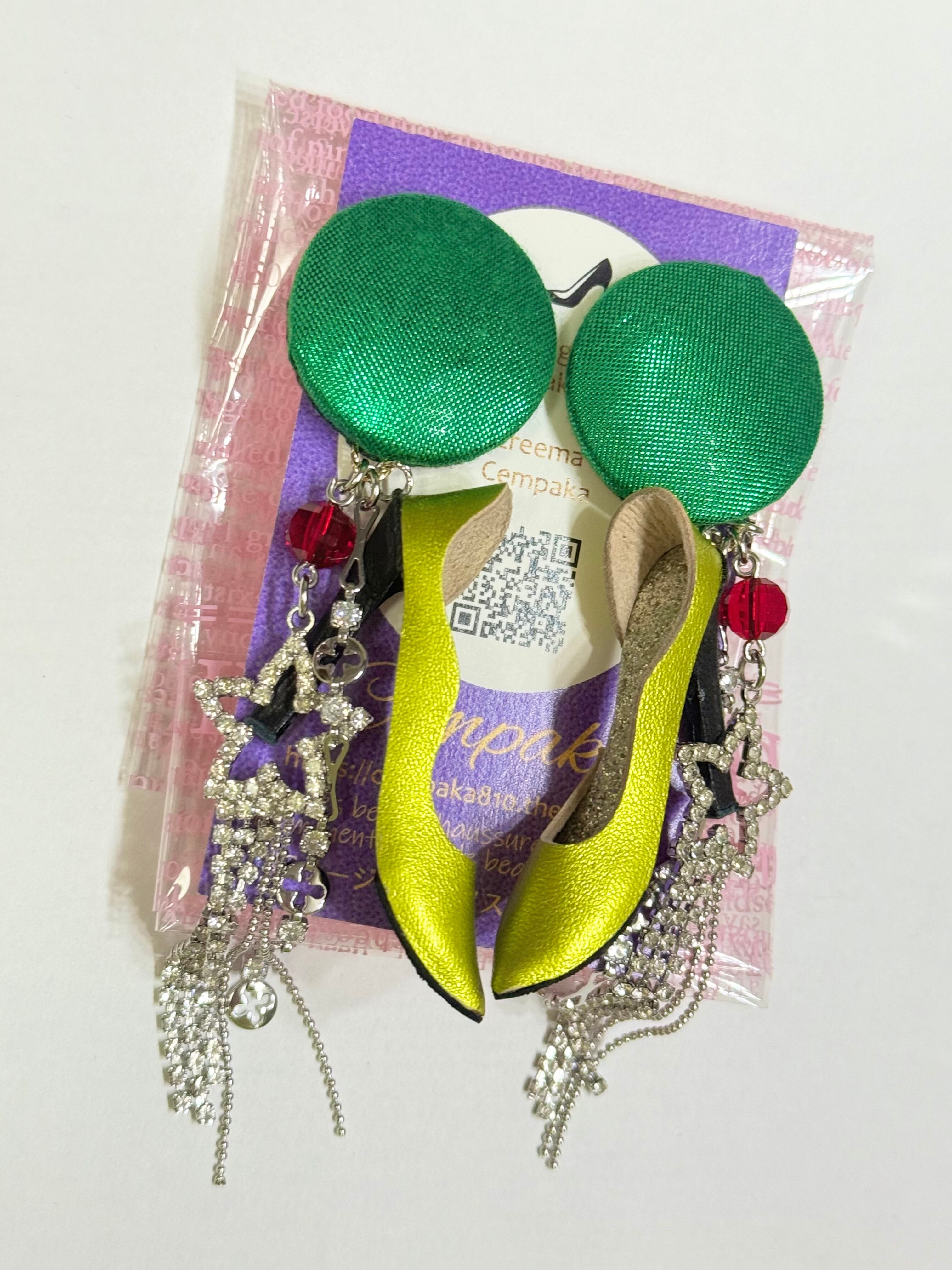 イスラエルのメタリックグリーンのヴィンテージボタンに蛍光イエロー×メタリックシルバーの中敷を合わせました✨