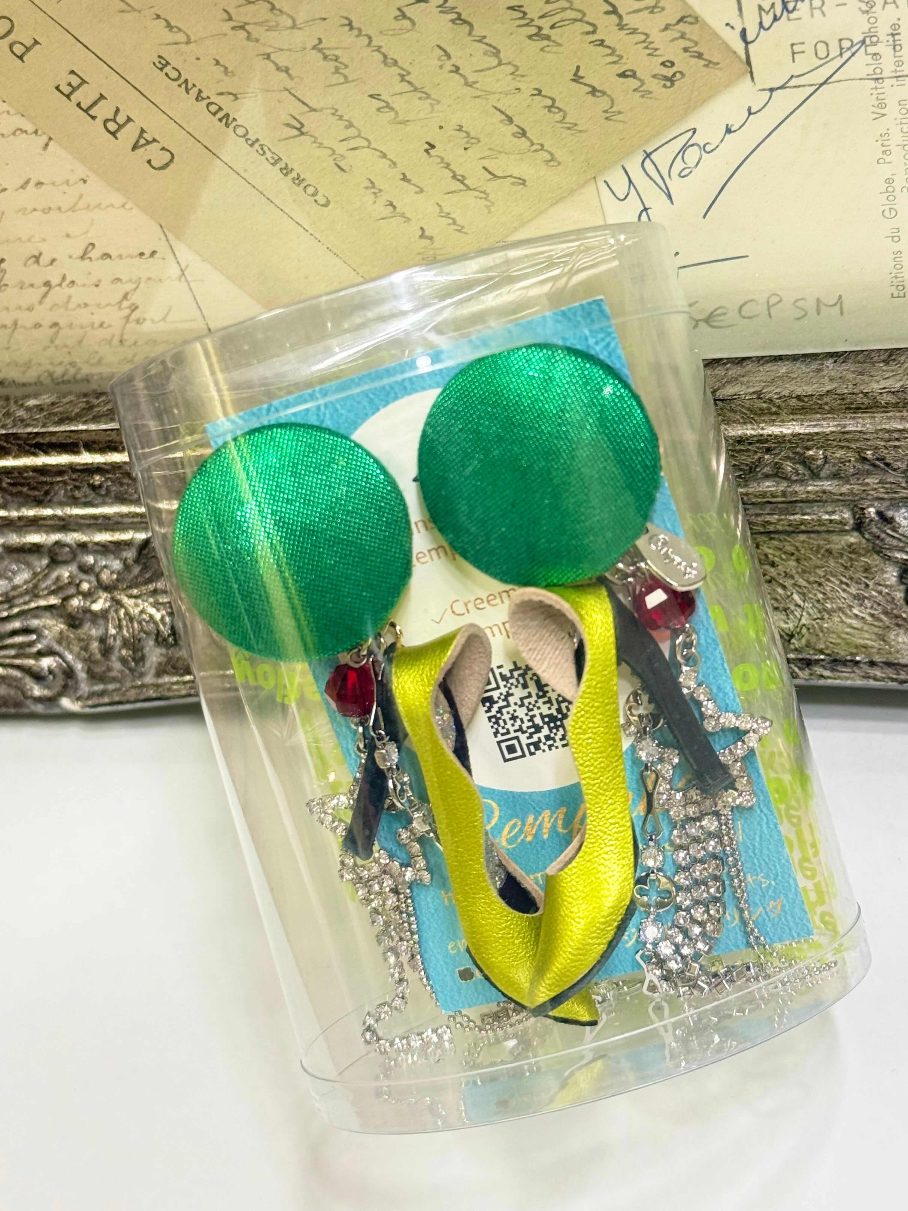 イスラエルのメタリックグリーンのヴィンテージボタンに蛍光イエロー×中敷が水玉柄のハイヒールを合わせました✨