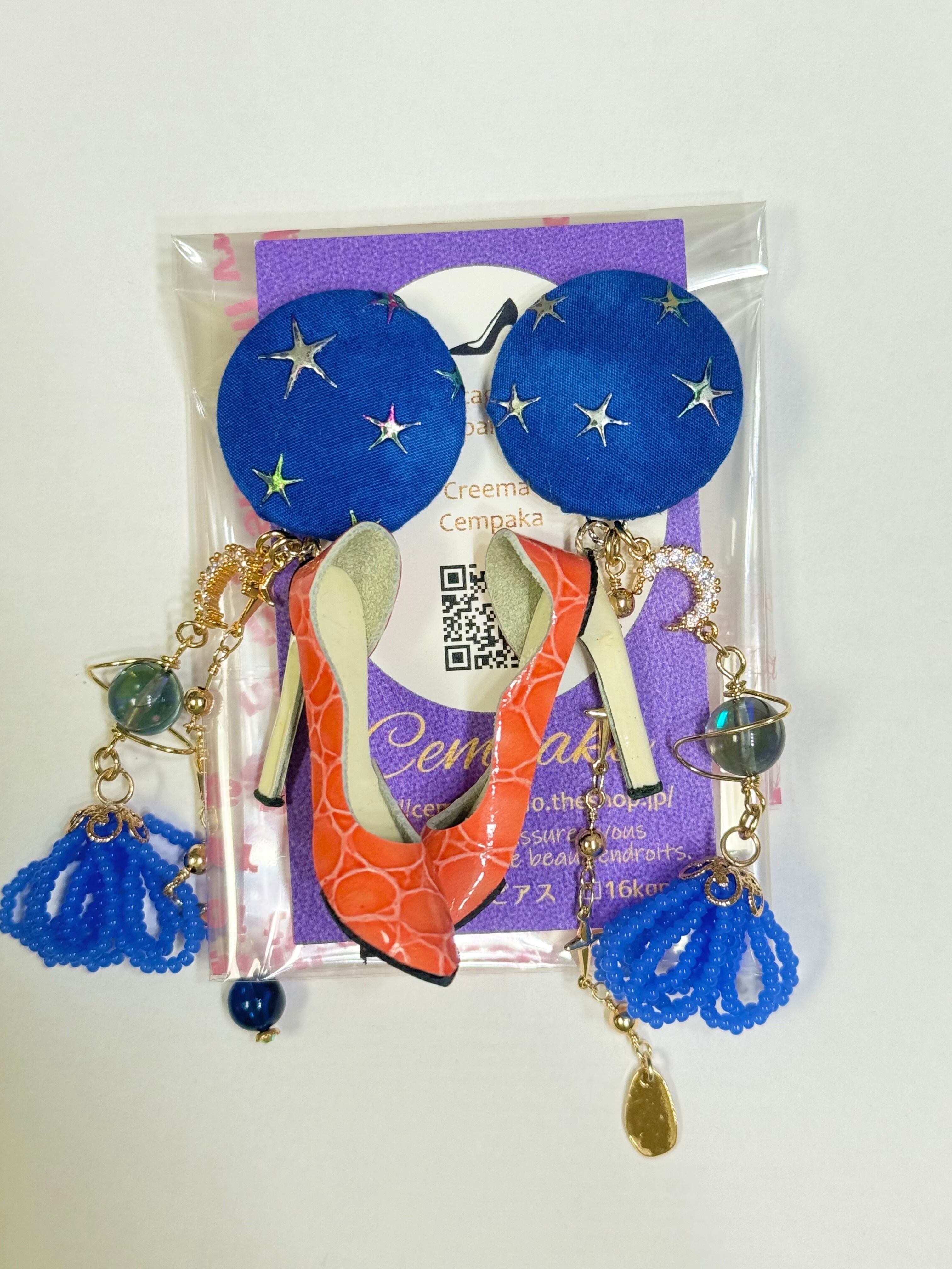 イスラエルの星模様のヴィンテージボタンにオレンジの柄×中敷が白のハイヒールを合わせました✨