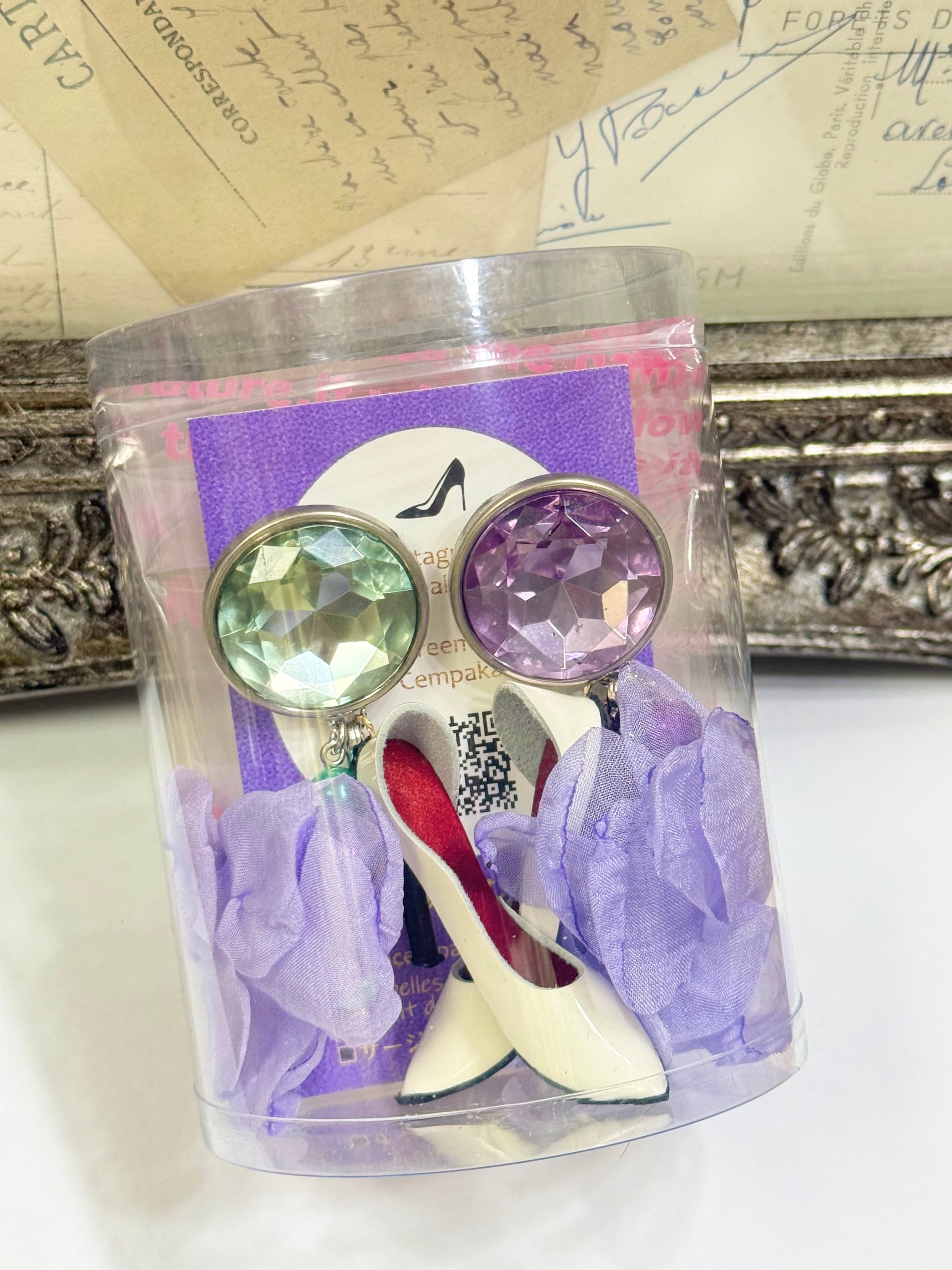 グリーンとパープルのジュエルボタンにエナメルの白×中敷が赤のハイヒールを合わせました✨