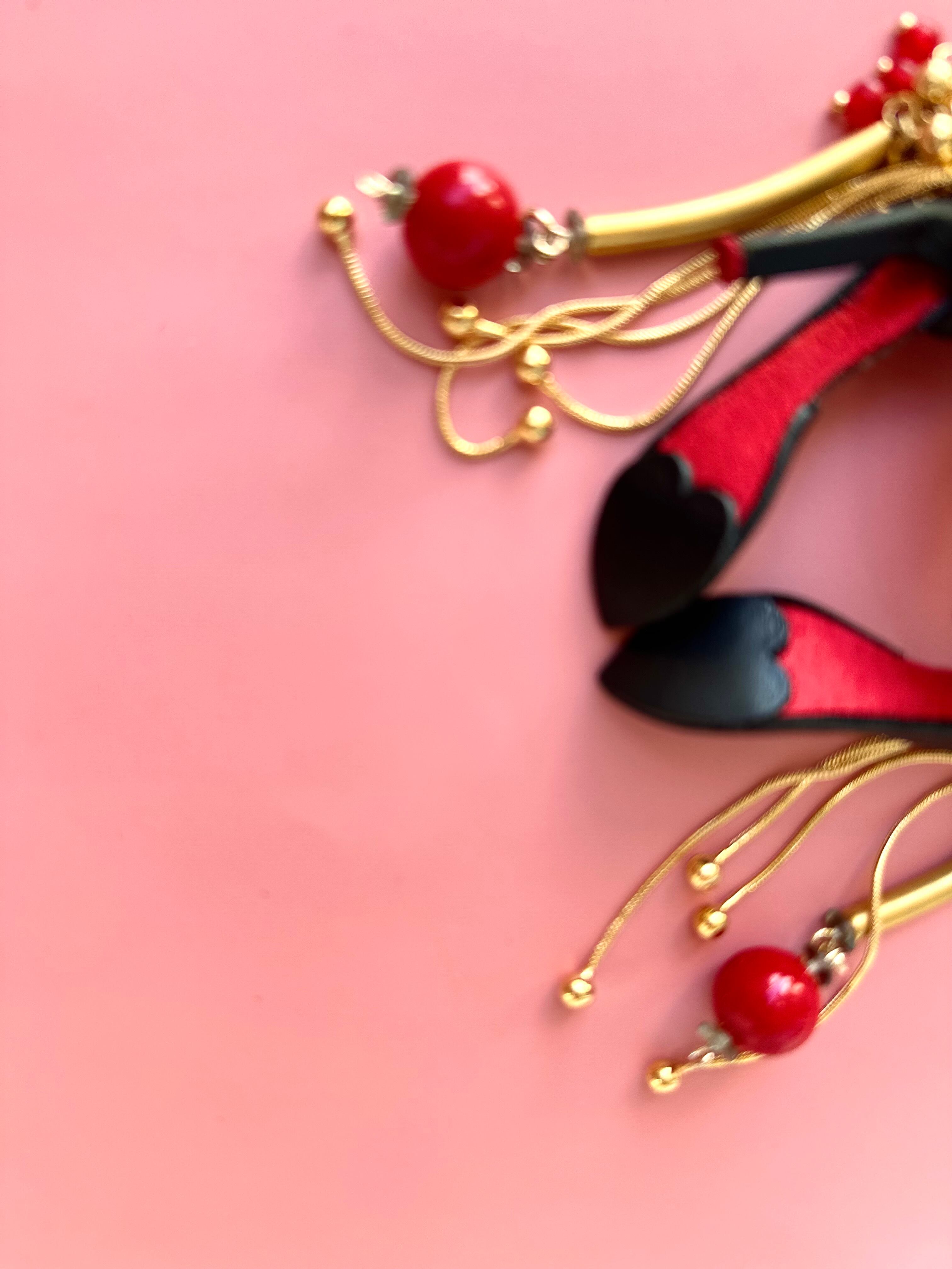 ドットの可愛いメタルのイヤリングにブラック×赤エナメルの中敷のハイヒールを合わせました✨