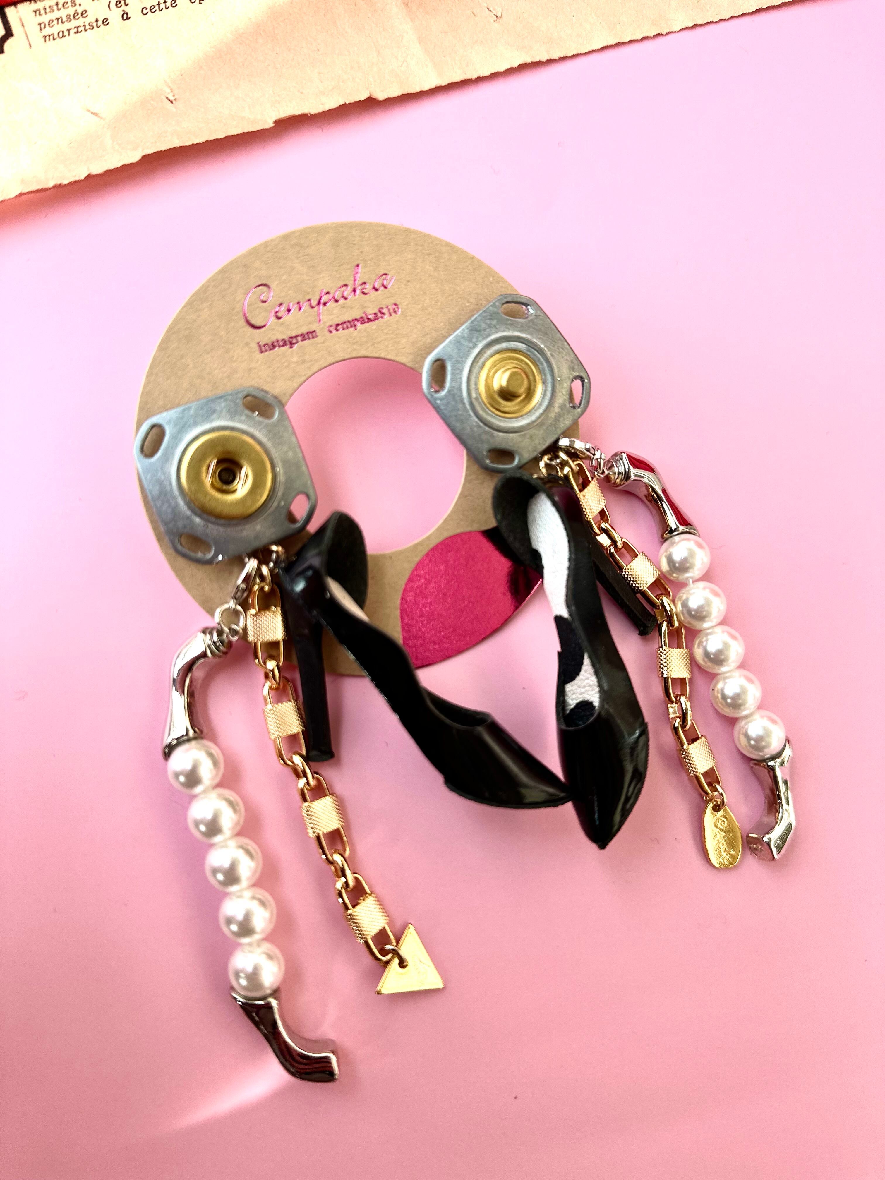 ドイツのスナップのヴィンテージボタンにブラックエナメル×牛柄の中敷のハイヒールを合わせました。