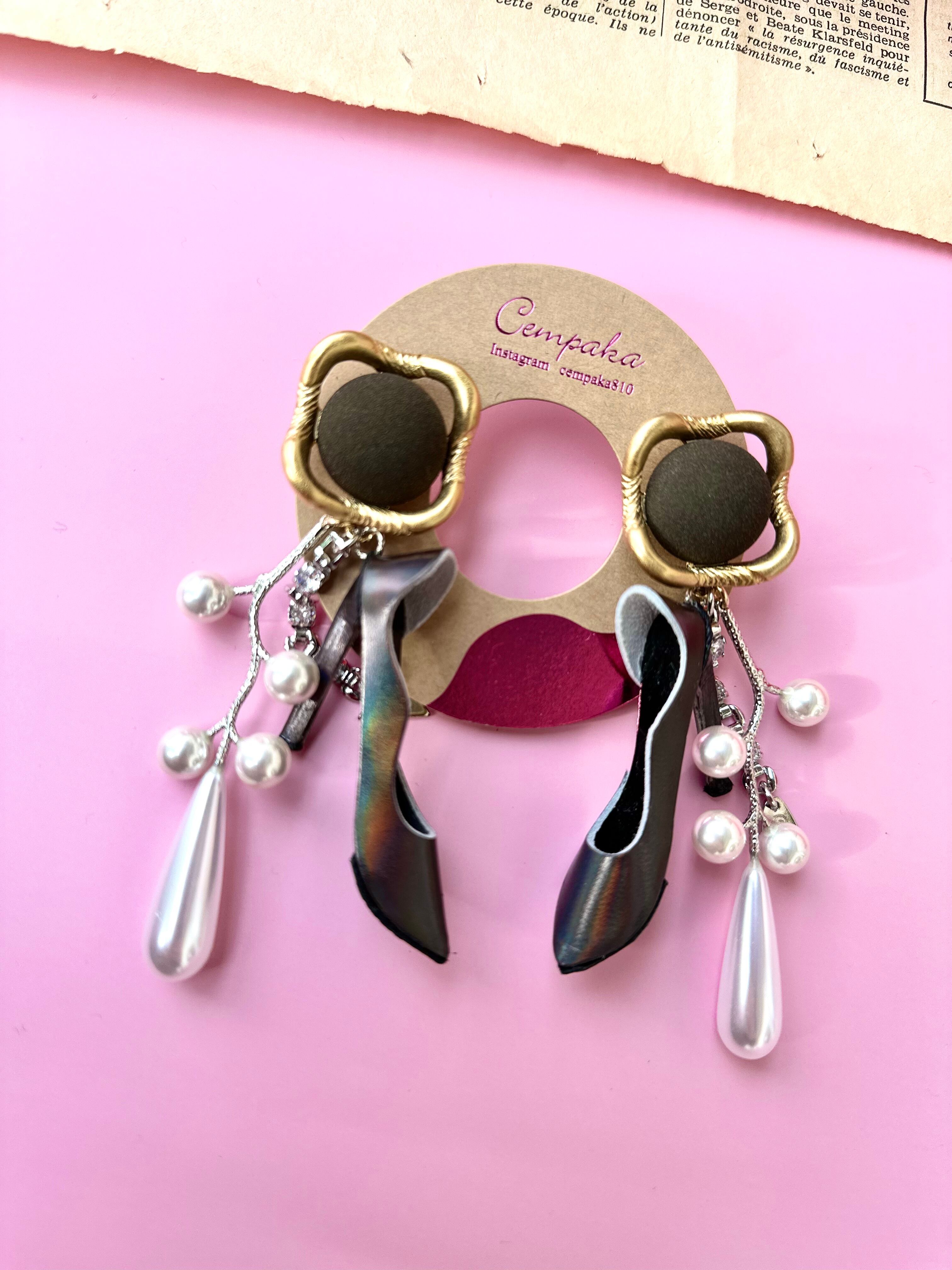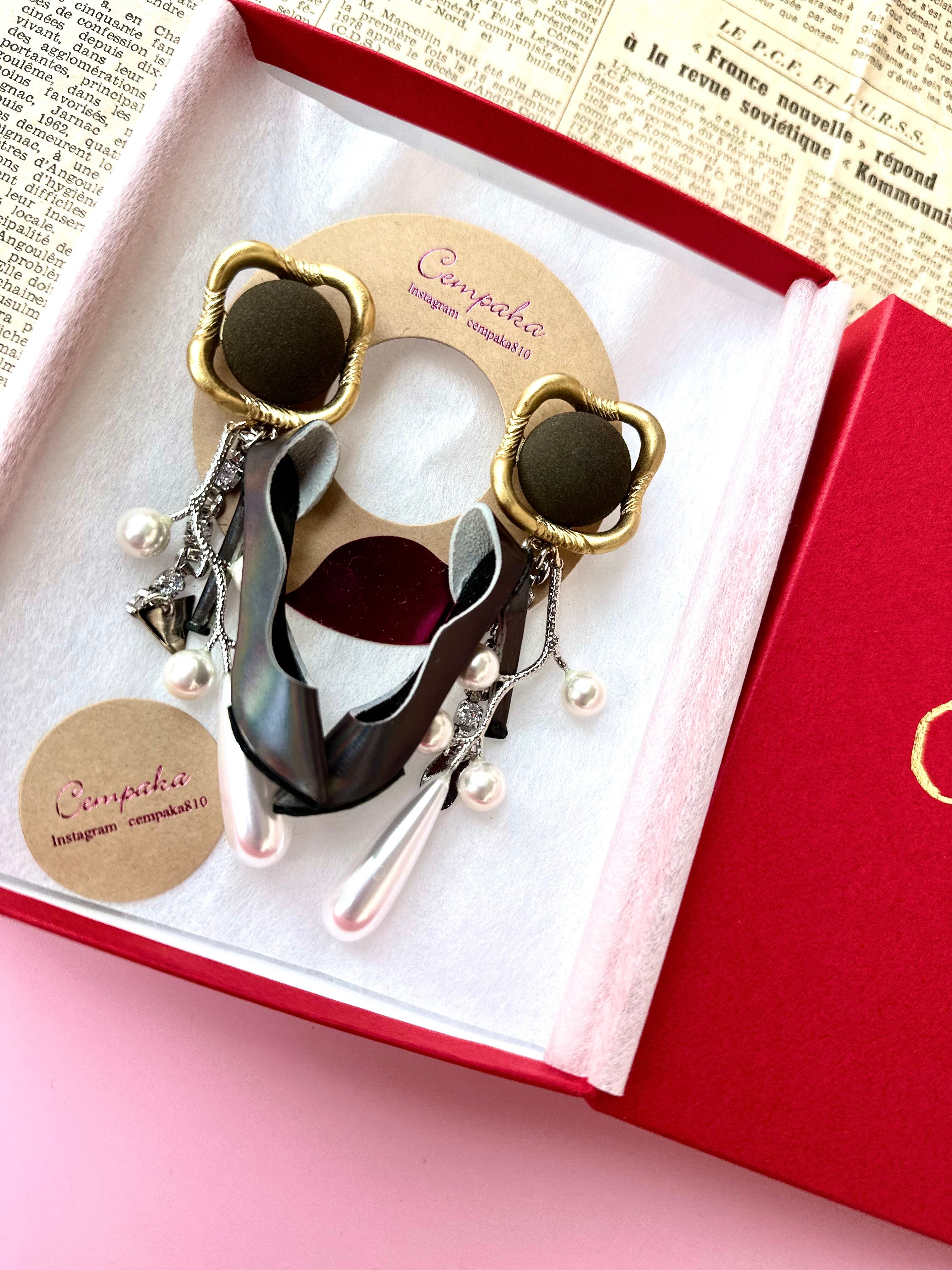 ヴィンテージボタンにメタリックシルバー×ブラックの中敷を合わせます。