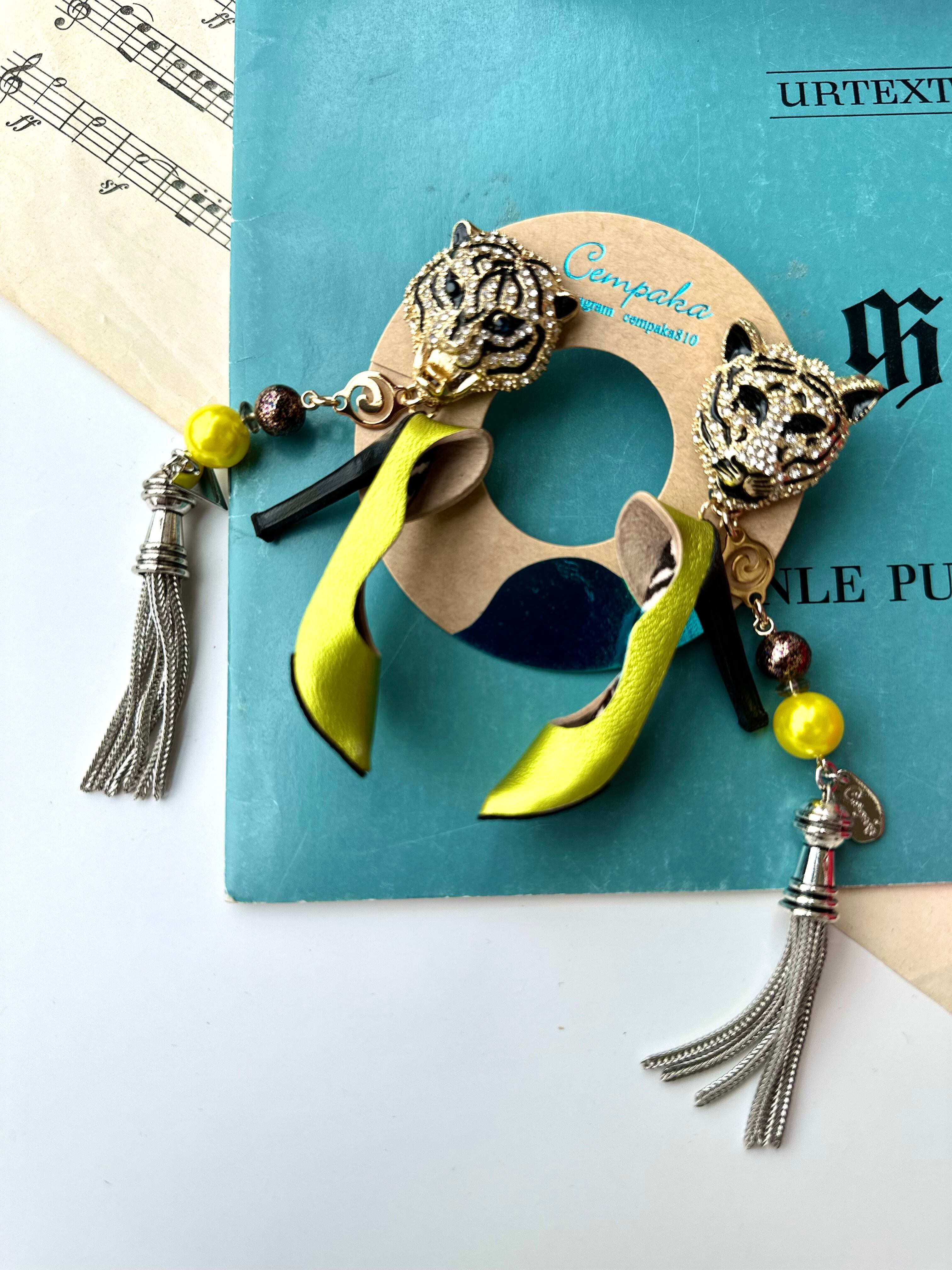 虎のブローチを加工してイヤリングにして蛍光イエロー×ゼブラの中敷のハイヒールを合わせました。個性的なカッコいいアクセサリーです。