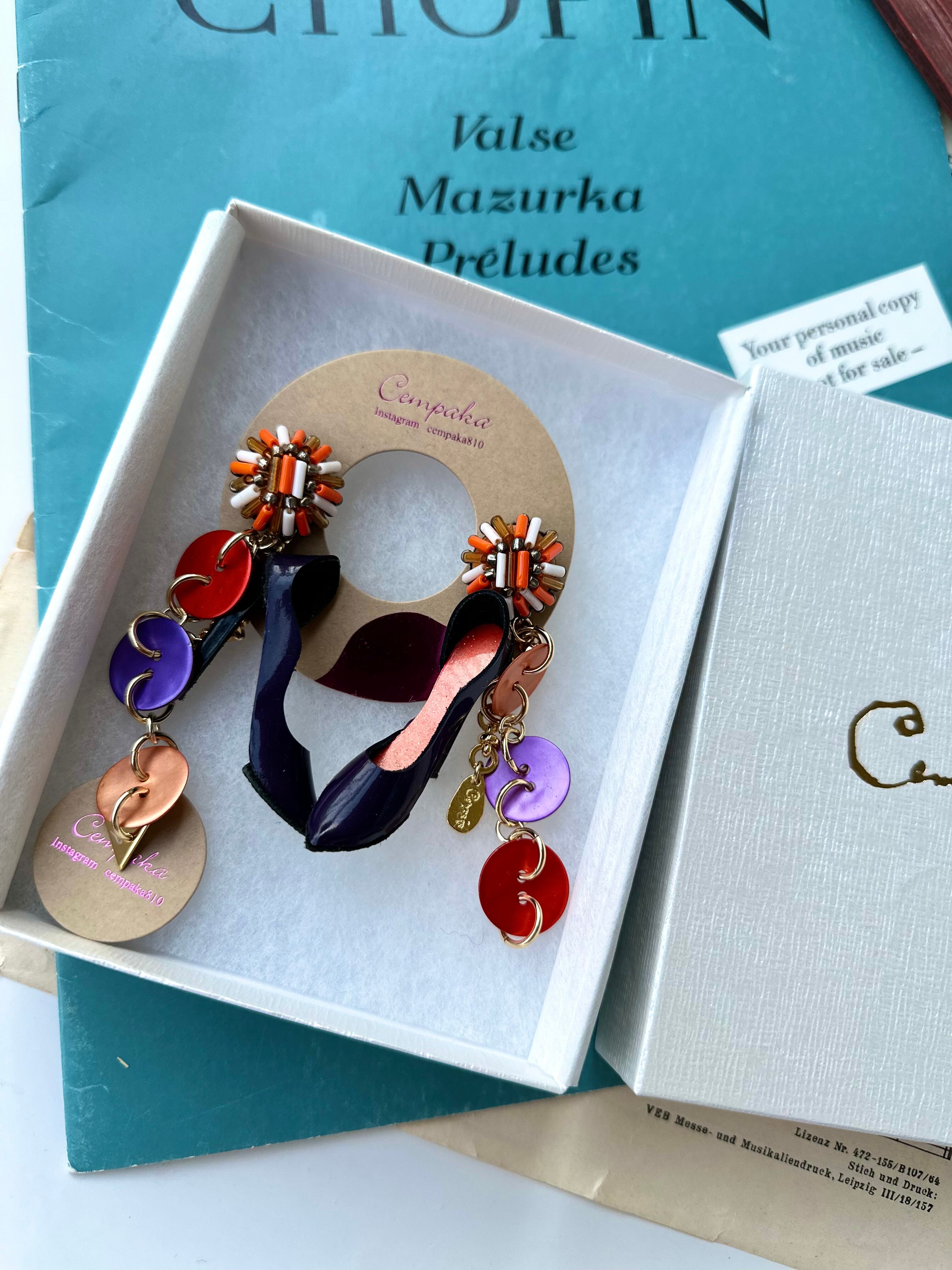 イヤリングのオレンジと紫×中敷オレンジラメのハイヒールがピッタリでサイドのボタンもフランスヴィンテージボタンを使用しております。