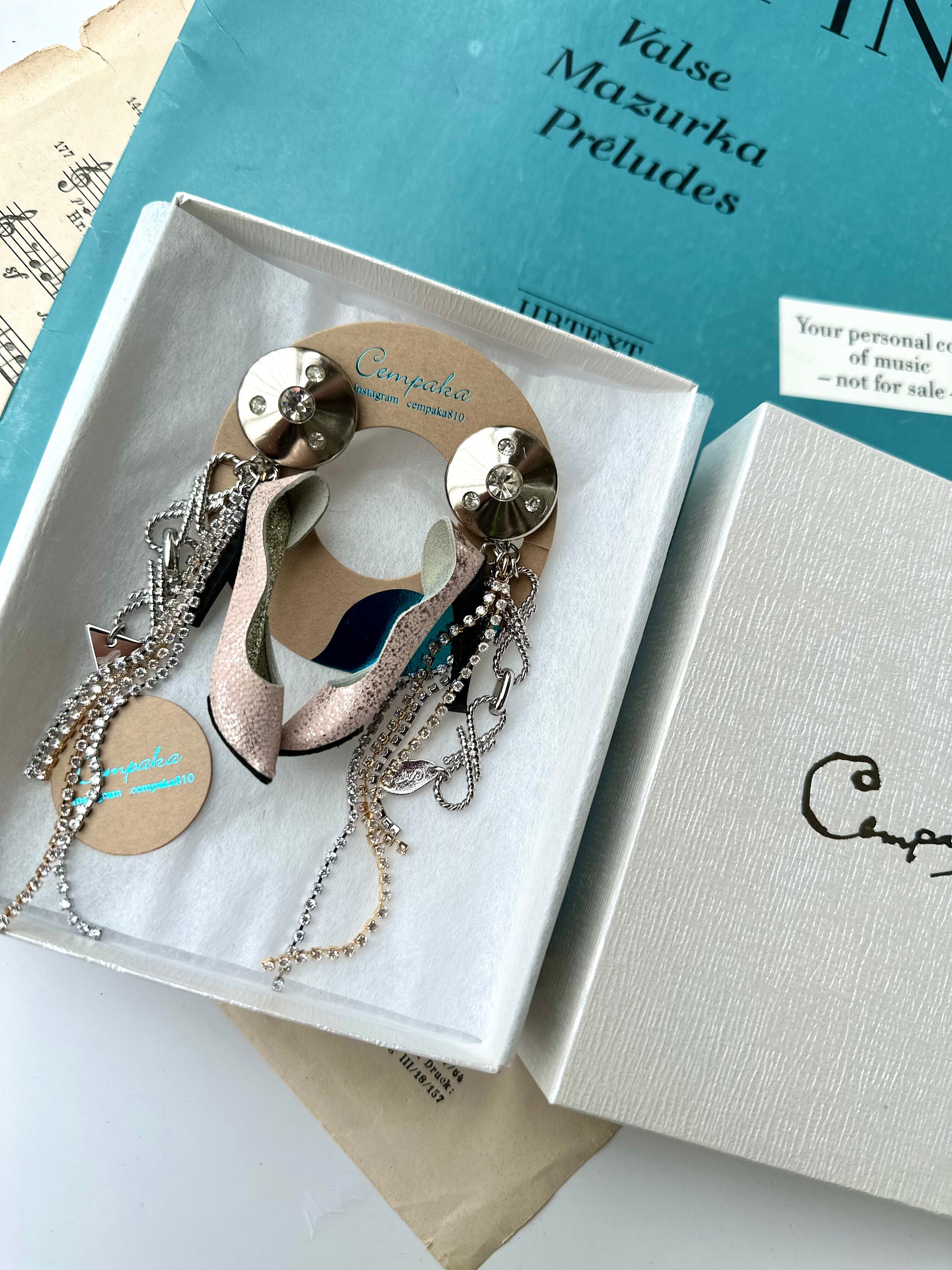 シルバーにビジュが埋め込まれている上品なイヤリングにぴんくにシルバーラメのハイヒールを合わせてサイドも上品にキラキラするチェーンをつけました。