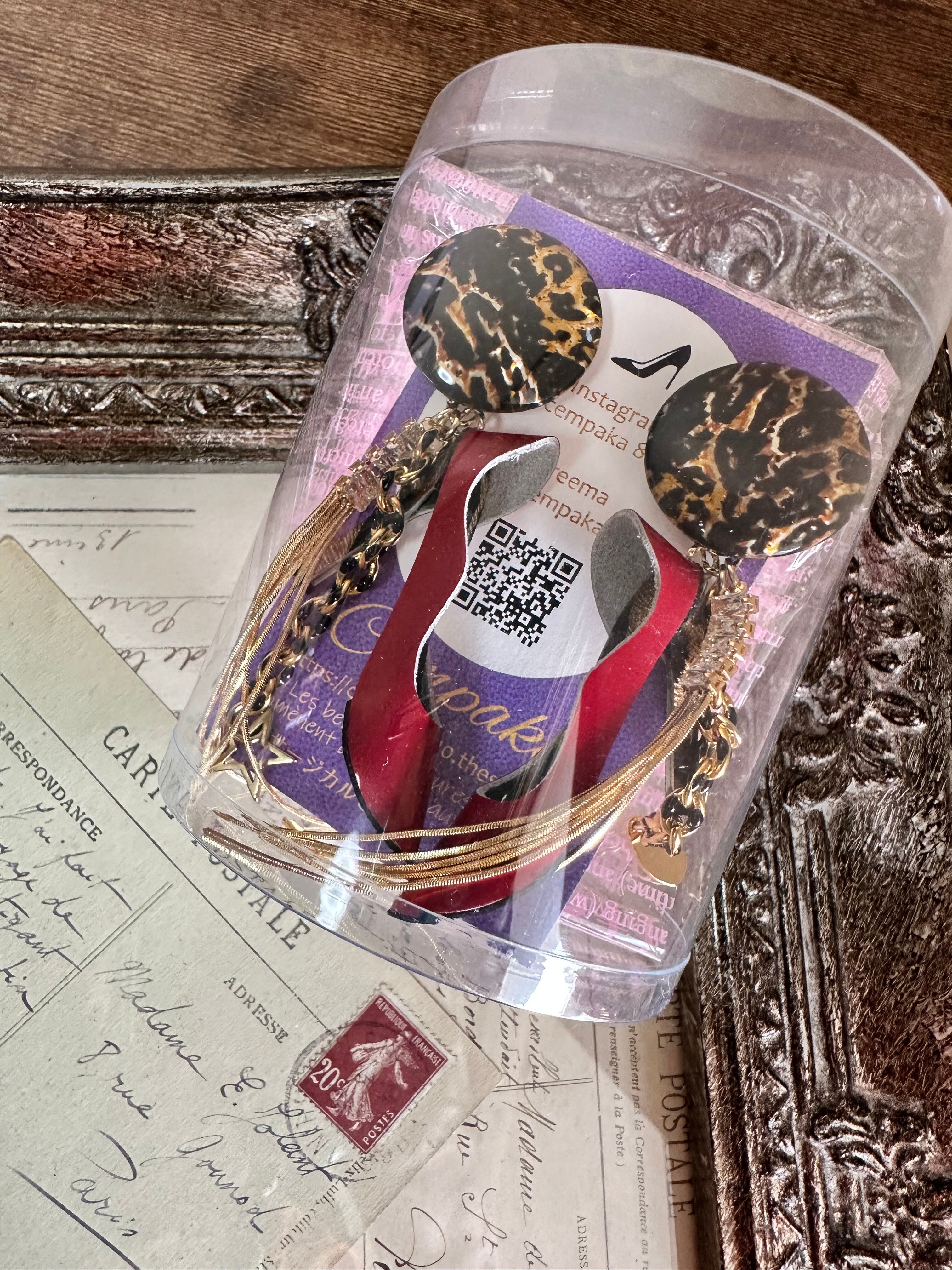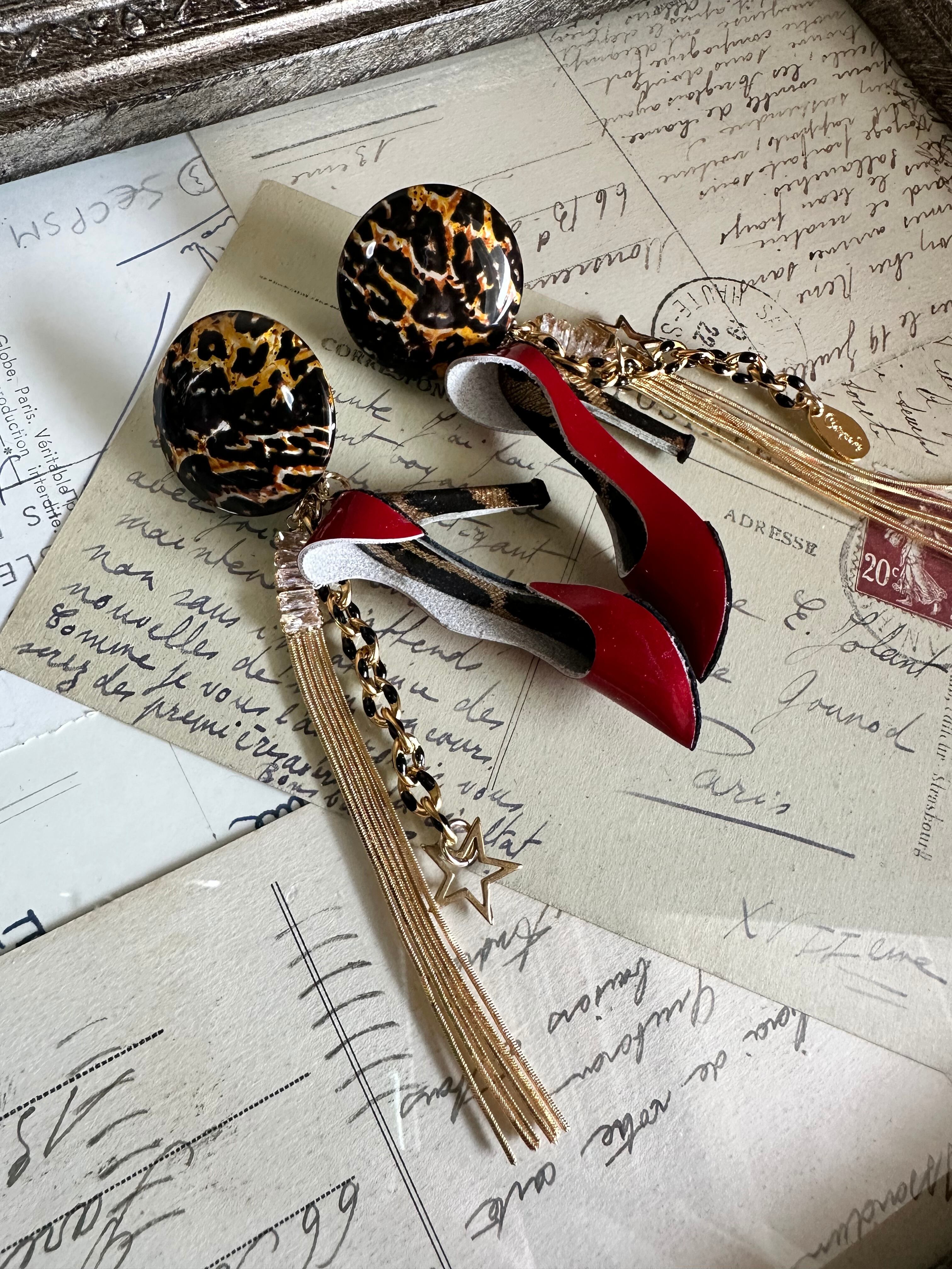 カナダのヴィンテージボタンに赤×レオパードの中敷に黒のふわふわのタッセルを合わせました。